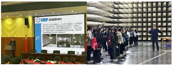 接着,赵佳洋主任为同学们针对《医用电气设备电磁兼容测试概述》方面的专业知识进行讲解,同时参观了电磁兼容检验室,先后讲解了医疗射线机的检测原理和工作方式、电磁场性质、实验室材料构成、控制室布局等专业知识,介绍了辐射发射测试实验、射频功能测试实验中可能出现的情况,随后结合相关理论与员工们就具体实践问题深入讨论交流,员工们对未来的实习工作产生了更加浓厚的兴趣。