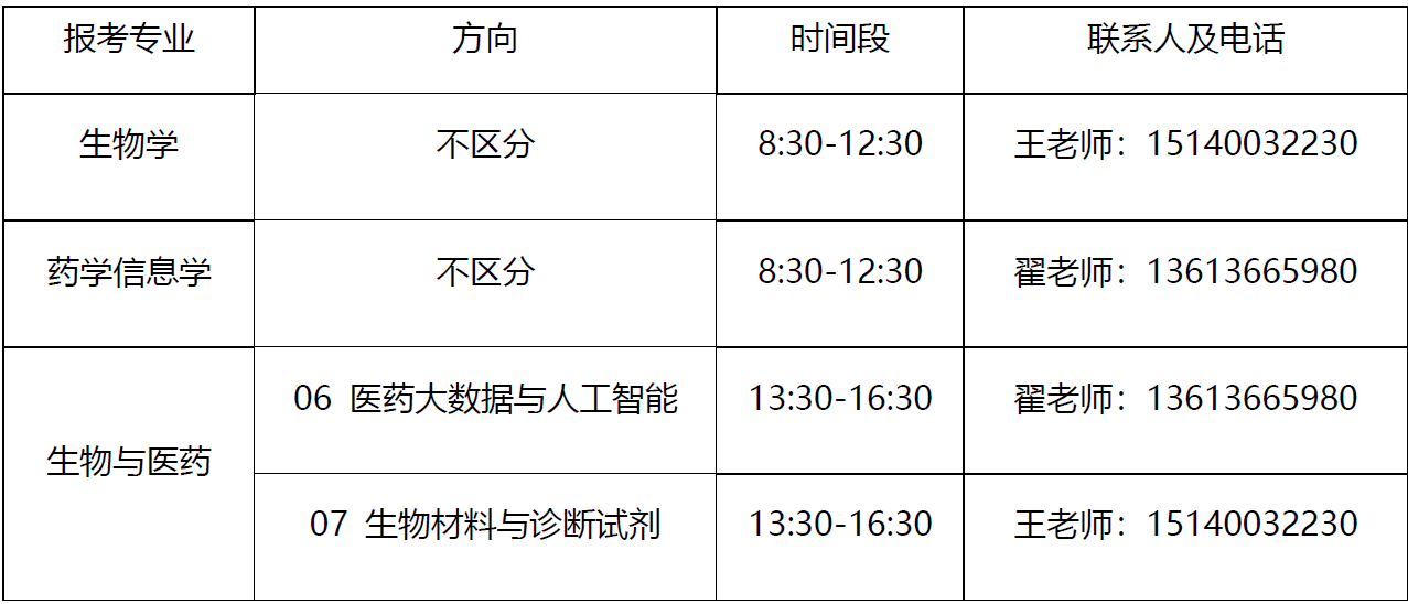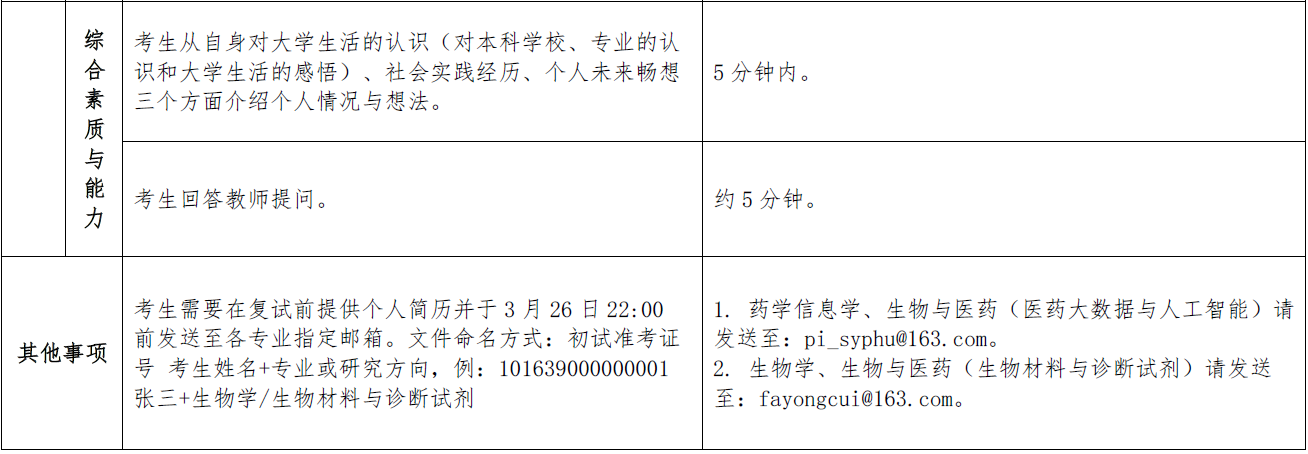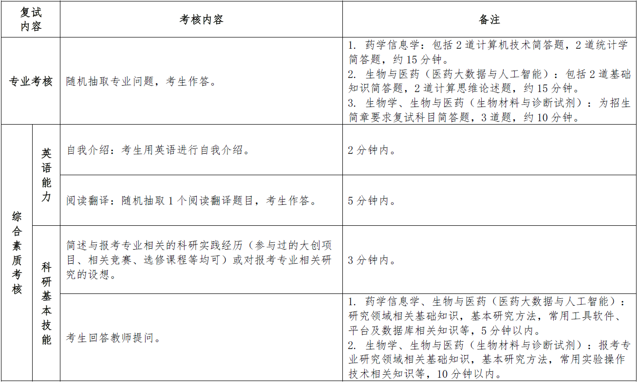 表1. 各专业复试内容及要求明细表